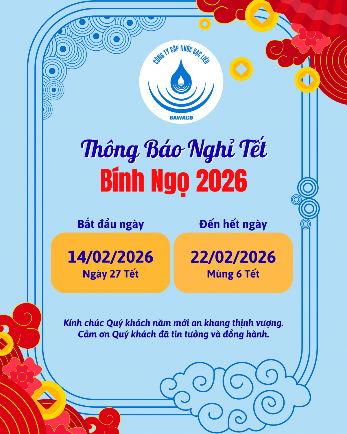 Công ty Cổ phần Cấp nước Bạc Liêu xin trân trọng thông báo đến Quý đối tác, khách hàng lịch nghỉ lễ Tết Nguyên đán Bính Ngọ năm 2026 như sau: